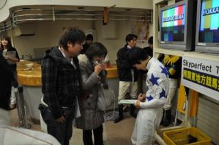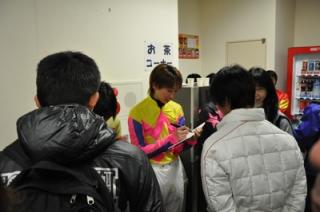 本日、今年の最終日を迎えた門別競馬場では、開門と同時に多くのお客様にご来場いただき、来場者プレゼントとして、石狩鍋や競馬グッズが当たるファン感謝抽選会、売店による人気メニューが390円で提供されるサンキューイベントなどが門別競馬場で実施されました。最終レース終了後は、ホッカイドウ競馬のジョッキーとの交流会&サイン会が行われ、パティスリーパサパさんからのケーキを囲み大勢のファンの方々が交流を楽しみました。