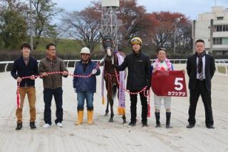 レースは、パドドゥ号(笠松)が先頭に立ち、カクシアジ号が4番手をキープし、最終コーナーへ。最後の直線では、リックタラキチ号を捕えると2着フラッシュモブ号に1馬身1/2差をつけて優勝しました(タイム 1.42.5)。