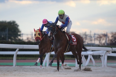 行けたら行ってほしい、との指示でしたが、スタートもっさりで出が良くなくて、あの位置取りに。力のない馬に前に行かれてしまったので、内心「まいったなぁ」と思いながら進路をさぐって進める形になりました。掛かる馬ではないと聞いていましたが、その通り、道中いきたがる訳でもなく、砂をかぶっても全然平気。園田で重賞を勝った時は先に行って、なかなかハミもかからず物見ばかりしていたと聞きましたが、追走自体は非常にスムーズでしたね。4コーナーで力ある馬(③着リックタラキチ)が先に抜け出してくれて、一頭分スペースが出来たので、迷わずそこをついて追い