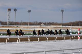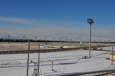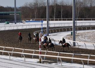 冬期間の調教が続く門別競馬場