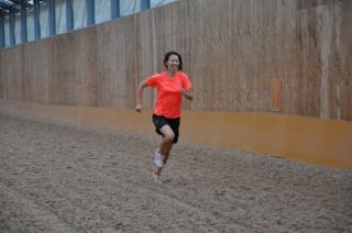 写真中:屋内調教坂路を見学した福島千里様