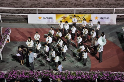 本年から牝馬限定競走となったブリーダーズゴールドカップのプレゼンターとして、陸上界のトップアスリートであり、道内出身者で世界的に活躍している、北海道ハイテクACの福島千里様にプレゼンターを務めていただき、表彰式に花を添えていただきました。また、静内高校吹奏学部の皆様には「花は咲く」とファンファーレを演奏していただき、澄み切った夏の夜空に響き渡りました。
