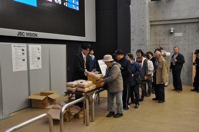 11月12日(水)、第9競走美唄産「雪蔵工房」新米賞、第11競走美唄産「峰ななつぼし」新米特別競走を記念して、美唄産のお米が当たる抽選会を実施しました。抽選会開始前から長蛇の列ができ、大変好評を得ておりました。(提供:美唄市)