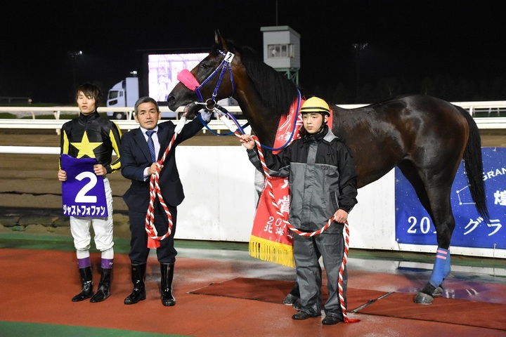 本日のメイン競走、北海道新聞社杯 第37回 王冠賞 〔H2〕(モンテロッソ賞)[ダート1,800m(外) 雨・不良]が行われ、3番人気ジャストフォファン号が2着スティールキング号に4馬身差をつけて優勝しました(タイム:1.51.9)。