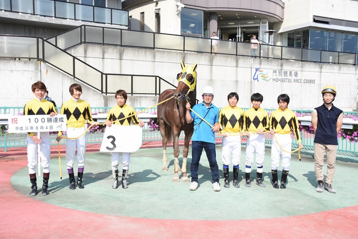 井上幹太騎手100勝達成 その他 2016.08.04 8月4日(木)、門別競馬 第1レースで井上 幹太(いのうえ かんた)騎手(堂山 芳則きゅう舎所属)がヘイジュード号に騎乗し、1,105戦目で地方・中央通算100勝を達成しました(ホッカイドウ競馬では現役22人目)。