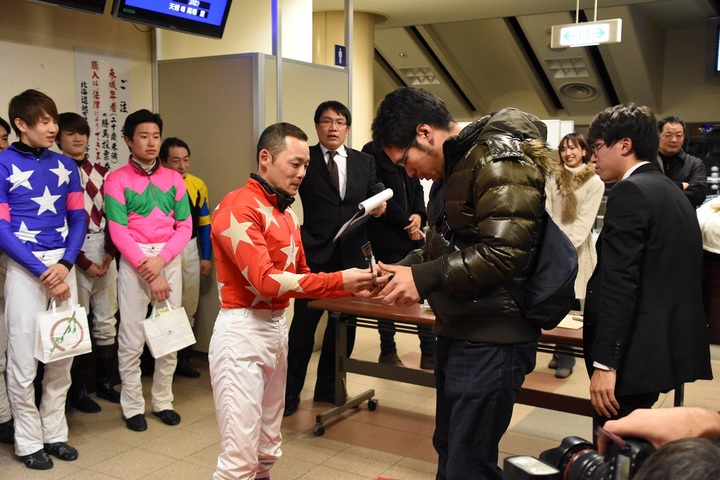 道営記念終了後には、毎年恒例となった「ジョッキー交流会」が実施され、パティスリーパサパさんからご提供のケーキを囲み大勢のファンの方々がジョッキーとの交流を楽しんでおられました。