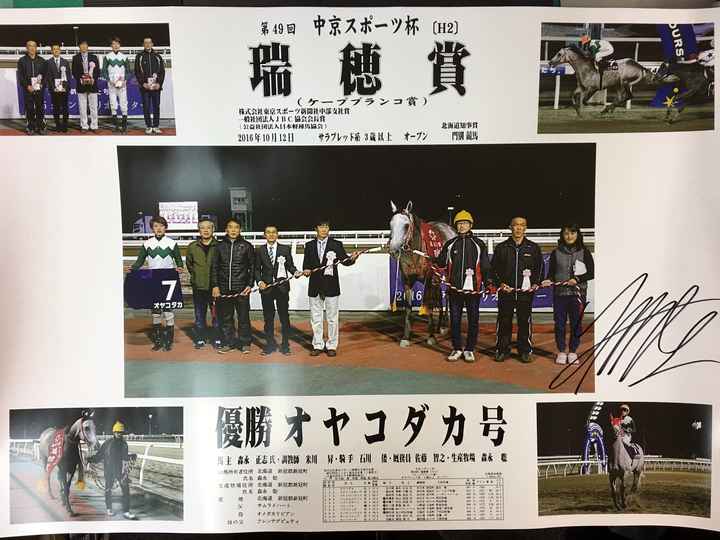 10月12日(水)に実施された重賞競走「第49回瑞穂賞」を優勝した、オヤコダカ号の関係者様のご提供により、第49回瑞穂賞優勝ポスターに石川倭騎手がサインをしたものを、抽選で20名様にプレゼントいたします。
