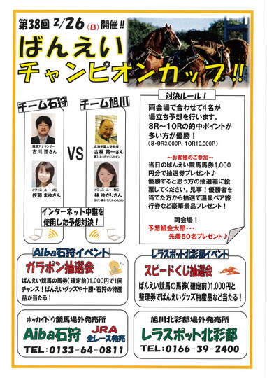 Aiba石狩(サテライト石狩)では、2月26日(日)ばんえいグッズや十勝・石狩の特産品が当たるガラポン抽選会、場立ち予想対決などのイベントが実施されます(詳細は下記のリンクからご覧ください)。お近くの方はぜひ足をお運びください。
