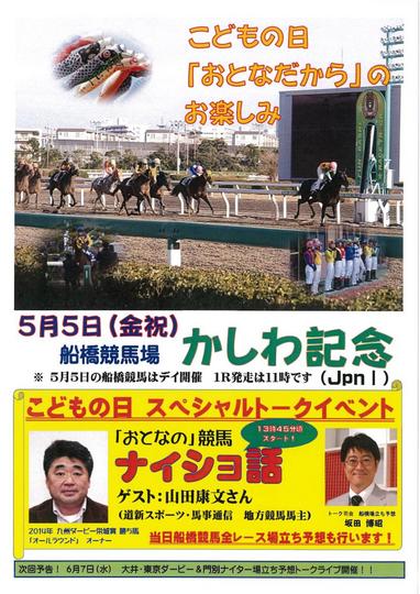 Aiba石狩(サテライト石狩)では、5月5日(祝金)、山田康文さんをゲストに迎えて「こどもの日 スペシャルトークイベント『おとなの』競馬 ナイショ話」が行われます。また、「かしわ記念(JpnⅠ)」をはじめとした、当日の船橋全レース場立ち予想も行われます。(詳細は下記のリンクからご覧ください。)お近くの方はぜひ足をお運びください。