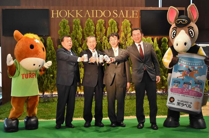 本日、札幌競馬場の特設会場にて記者会見が行われ、関係者によるトークセッションや記念撮影が行われました。記念撮影にはホクト君も登場し、「サッポロ生ビール黒ラベル HOKKAIDO競馬/JRA缶」の発売をPRしました。