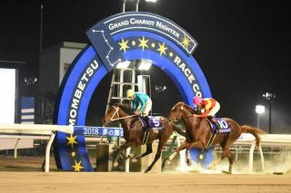 本日のメイン競走、北海道新聞社杯 第39回 王冠賞〔H2〕(ストロングリターン賞)[ ダート1,800m(外) 晴・良 ]が行われ、2番人気クロスウィンド号が2着マッドドッグ号にクビ差をつけて優勝しました。(タイム:1.57.5)