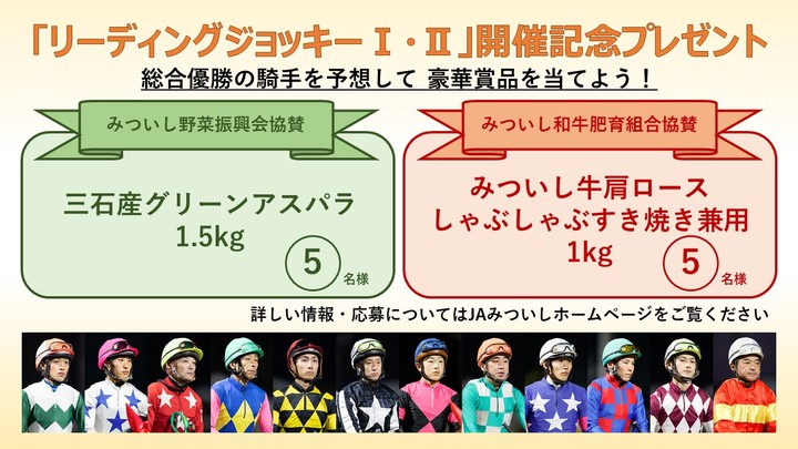 ご希望の方はJAみついしホームページの応募専用バナーより、リーディングジョッキーⅠ・Ⅱの総合優勝騎手を予想し、ぜひご応募ください。