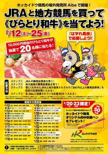 ホッカイドウ競馬場外発売所Aiba(J-PLACE)および門別競馬場では、2月12日(土)から2月25日(金)までの間、「JRAと地方競馬を買って《びらとり和牛》を当てよう!」イベントを実施します。