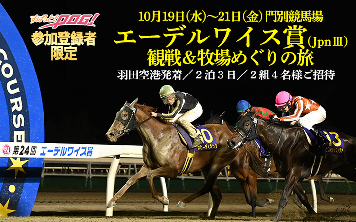 SPAT4では、「すぱっと!POG!2022-23」の参加登録をして頂いている会員様を対象に、抽選で2組4名様に「門別競馬場エーデルワイス賞観戦&牧場めぐりの旅(2泊3日)」にご招待する企画が、現在応募受付中です。