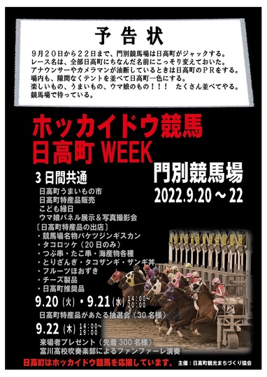 門別競馬場イベントについて(9月20日[火]~9月22日[木]日高町WEEK!)