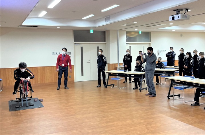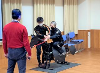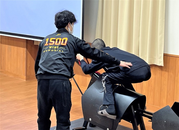 落合 玄太騎手が地方競馬教養センターでホッカイドウ競馬のPR活動を実施 その他 2022.12.06 12月5日(月)、本年度のホッカイドウ競馬リーディング騎手を獲得した落合 玄太騎手が、地方競馬教養センターに来所し、第105期騎手候補生にホッカイドウ競馬のPR活動を実施しました。 落合騎手と職員からホッカイドウ競馬の魅力等を説明した後は、騎手候補生達からの質問に答え、最後に騎乗フォーム等の確認を木馬を使って指導する場面もあり、騎手候補生達との貴重な時間を過ごしました。