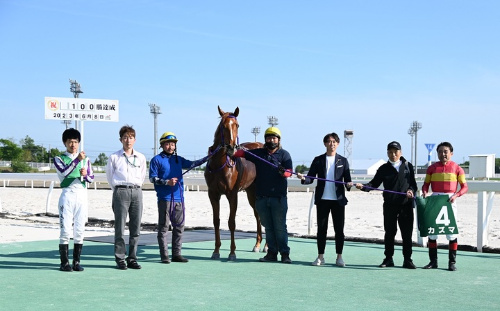 6月8日(木)、門別競馬 第4Rでカズマが1着となり、管理する櫻井拓章調教師は100勝(1,036出走)を達成しました。