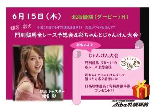 Aiba札幌駅前イベントについて(6月15日) レース情報 2023.06.14 Aiba札幌駅前では、6月15日(木)に北海優駿(ダービー)イベントを実施いたします。競馬キャスター蛯名彩さんによる門別競馬全レース予想会&彩ちゃんとじゃんけん大会を行いますので、皆さまぜひお越しください。