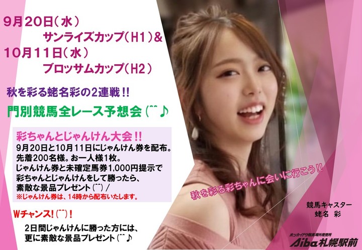 Aiba札幌駅前イベントについて(9月20日・10月11日) イベント 2023.09.15 Aiba札幌駅前では、9月20日(水)にサンライズカップと10月11日(水)にブロサッムカップイベントを実施いたします。競馬キャスター蛯名彩さんによる門別競馬場全レース予想会&彩ちゃんとじゃんけん大会を行いますので、皆さまぜひお越しください。