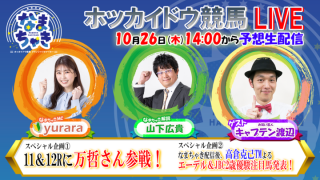 今回は、スペシャル企画①としてあの万哲さんが参戦(11Rと12R)!そして、なまちゃき配信終了後にスペシャル企画②として、来週に迫ったエーデルワイス賞(11月1日)とJBC2歳優駿(11月3日)の展望を高倉克己さんに伺いますのでお楽しみに!