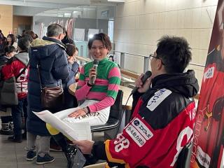 入場口でのグリーディングやトークショー、試合前の記念フェイスオフなど様々なセレモニーに出演させて頂きました。出演した宮内騎手は