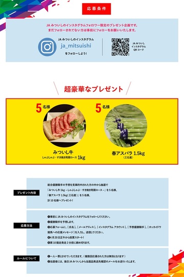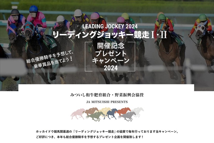 ご希望の方はJAみついしホームページの応募専用バナーより、リーディングジョッキーⅠ・Ⅱの総合優勝騎手を予想し、ぜひご応募ください。