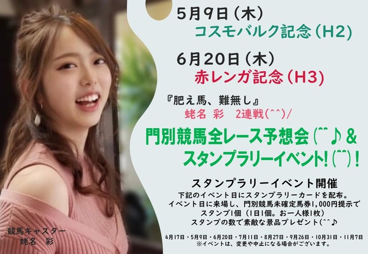 Aiba札幌駅前イベントについて(5月9日・6月20日) イベント 2024.05.01 Aiba札幌駅前では、5月9日(木)と6月20日(木)に競馬キャスター蛯名彩さんによる門別競馬場全レース予想会&スタンプラリーイベントを行いますので、皆さまぜひお越しください。