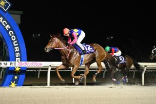 本日のメイン競走、新設重賞の第1回 フロイラインスプリント〔H3〕(アダイヤー賞)[ダート1,200m(外) 雨・稍重]が行われ、1番人気ヴィヴィアンエイトが2着ライトヴェールに21/2馬身差をつけて優勝しました(タイム:1.14.1)。