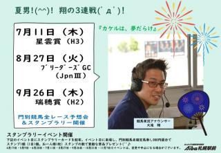 Aiba札幌駅前イベントについて(7月11日・8月27日・9月26日) イベント 2024.07.05 Aiba札幌駅前では、7月11日(木)・8月27日(火)・9月26日(木)に競馬実況アナウンサー大滝翔さんによる門別競馬場全レース予想会&スタンプラリーイベントを行いますので、皆さまぜひお越しください。
