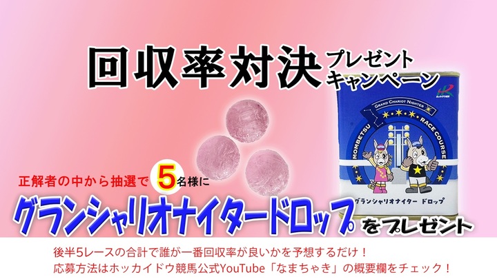 また、後半5レースの回収率対決を実施しております。視聴者の皆様には、誰が回収率で一番となるのか予想して頂き、的中者のなかから抽選で5名様に「グランシャリオナイタードロップ」をプレゼントしちゃいます。詳細については、概要欄に応募URLが記載されておりますので、皆様のご投票をお待ちしております。