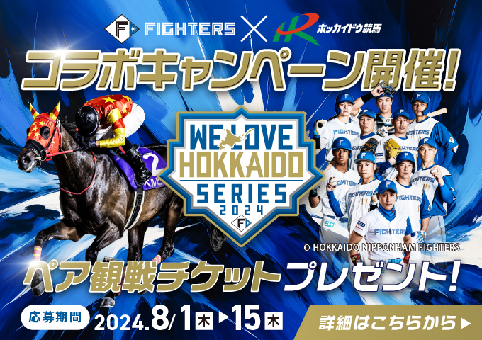 「北海道日本ハムファイターズ×ホッカイドウ競馬コラボキャンペーン」の第2弾として、9月8日(日)観戦チケットオリックス・バファローズ戦(エスコンフィールドHOKKAIDO)ペア25組・50名様にプレゼントいたします。