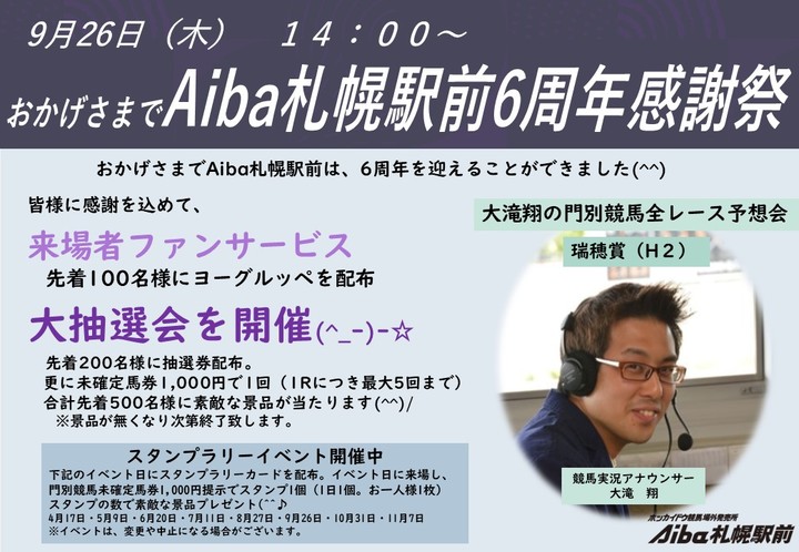 Aiba札幌駅前6周年感謝祭イベントについて(9月26日) イベント 2024.09.17 Aiba札幌駅前では、9月26日(木)にAiba札幌駅前6周年感謝祭として、以下のイベントを実施いたします。皆様のご来場お待ちしております。 ◇イベント内容 ・来場者ファンサービスとして先着100名様にヨーグルッペを配布いたします。 ・大抽選会を開催いたします。 ・競馬実況アナウンサー大滝翔さんによる門別競馬場全レース予想会&スタンプラリーイベントを行います。
