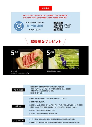 ご希望の方はJAみついしホームページの応募専用バナーより、リーディングジョッキーⅠ・Ⅱの総合優勝騎手を予想し、ぜひご応募ください。