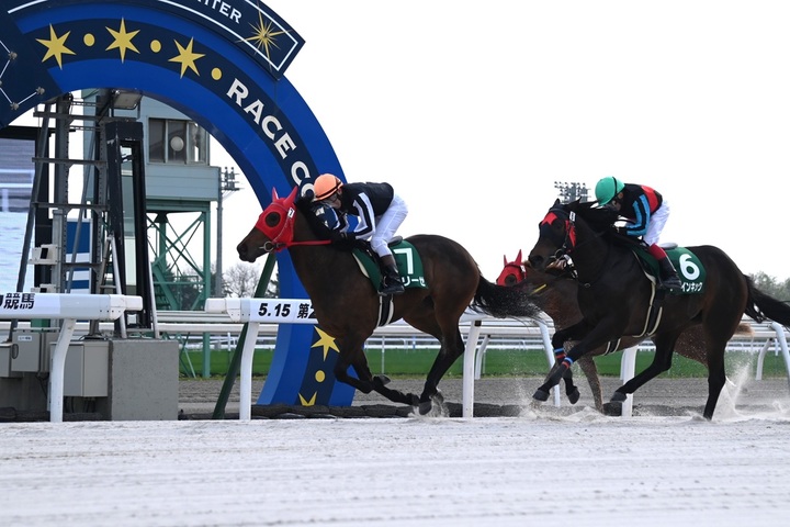 本日の第5競走は、2022年供用開始種牡馬産駒の限定 JRA認定競走 フレッシュチャレンジ競走[2歳新馬 ダート1,100m(外) 曇・良 ]が行われ、マテラスカイ産駒のグリーゼが2着ファインキックに1/2馬身差をつけて優勝しました。(タイム 1.09.4)