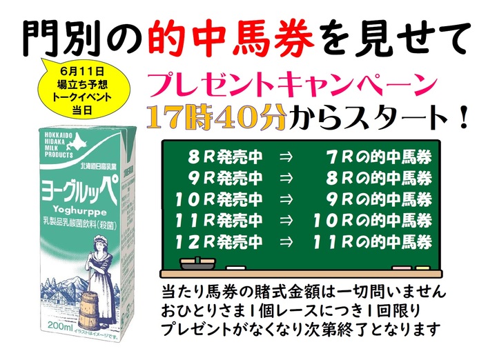 Aiba石狩では、6月11日(水)にブロードキャスター坂田博昭さんによる場立ち予想トークイベントを行いますので、皆さまぜひお越しください。また、当日のホッカイドウ競馬的中馬券をお見せいただいたお客様にヨーグルッペのプレゼントをお渡しします。対象となる馬券等詳細につきましては下記画像をご参照ください。