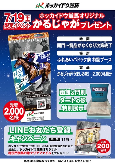 7月19日(土)の函館競馬では、「ホッカイドウ競馬PRイベント in 函館競馬場」を実施いたしますので、皆様のご来場をお待ちしております。