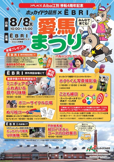 Aiba江別が移転後4周年を迎えることから、隣接する江別市の商業施設「EBRI」様と連携し「愛馬まつり」を開催します。